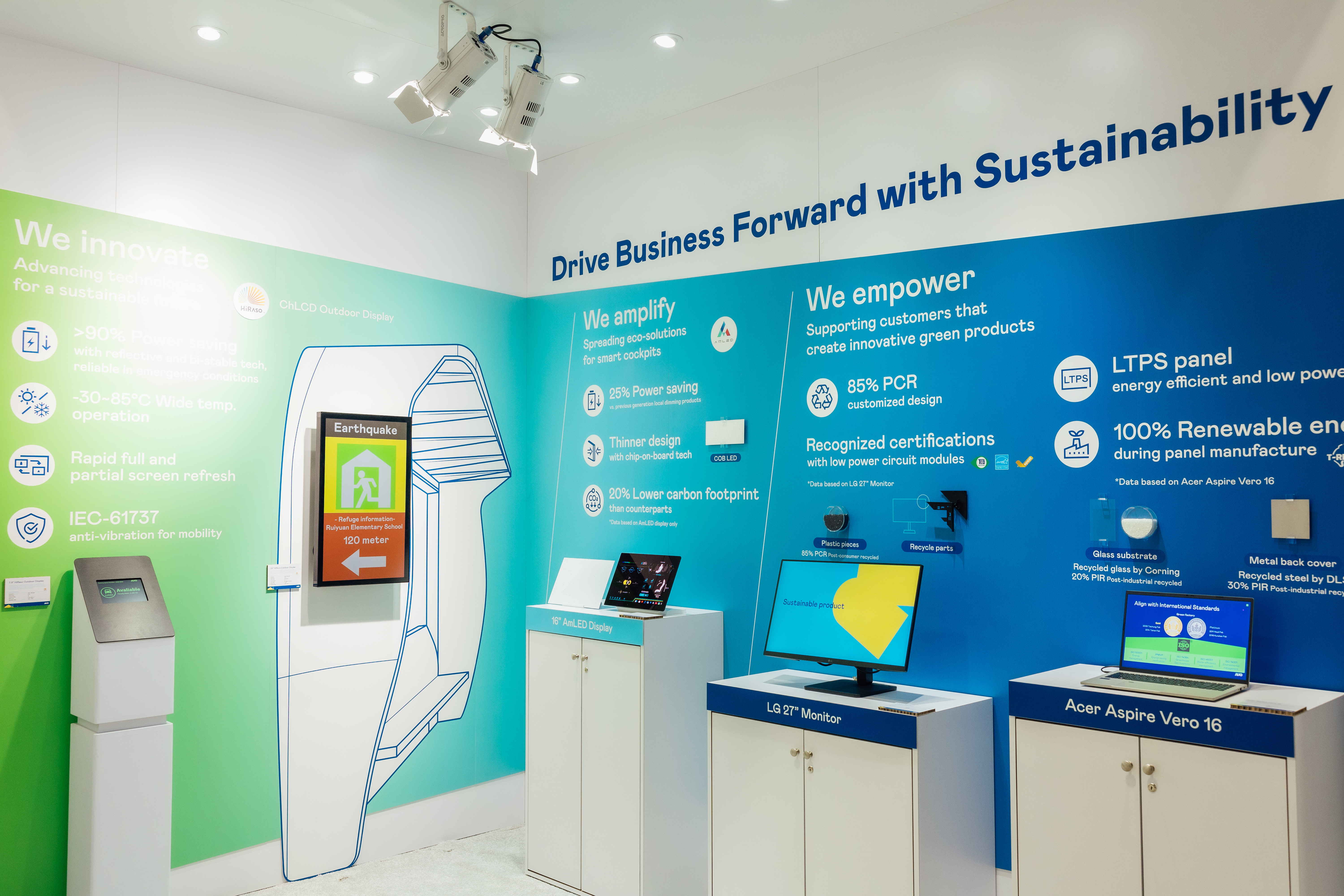 熊猫体育运用创新显示技术HiRaso胆固醇液晶双稳态技术达到显示零耗能、扩大节能省电的AmLED显示技术应用于车用产品、以再生的消费后回收(PCR)塑料及全绿电生产之面板,应用于笔电及萤幕,增加绿色价值。