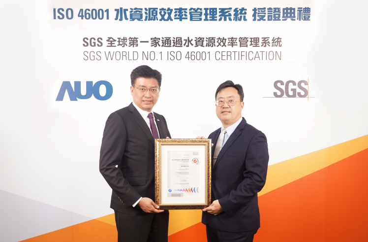 友達取得全台第一張 ISO 46001 水資源效率管理系統驗證,透過嚴謹且精進的管理系統,具體展現永續承諾 (左:友達製造營運群副總經理林挺立,右:SGS 台灣檢驗科技總裁邱志宏)
